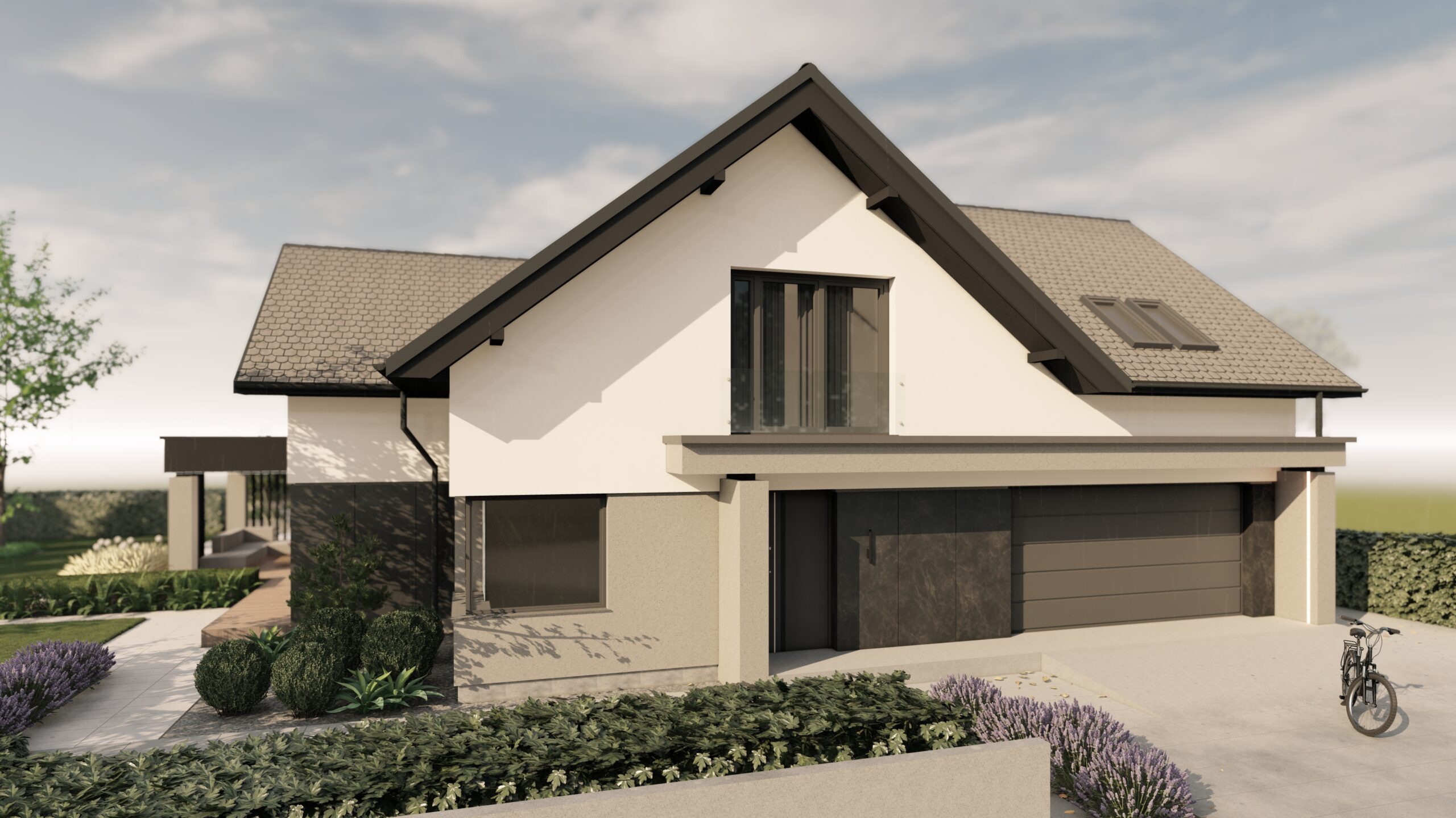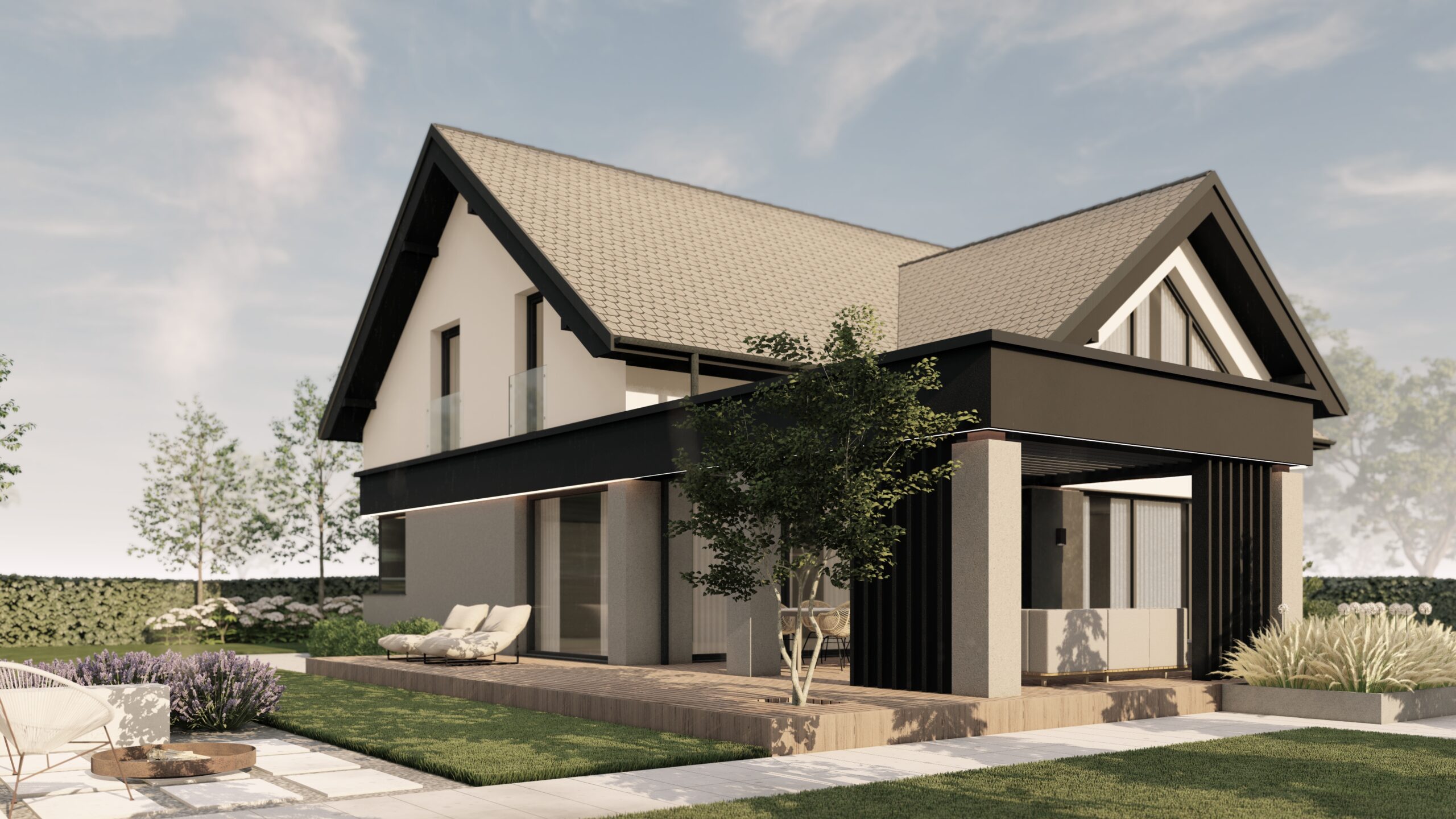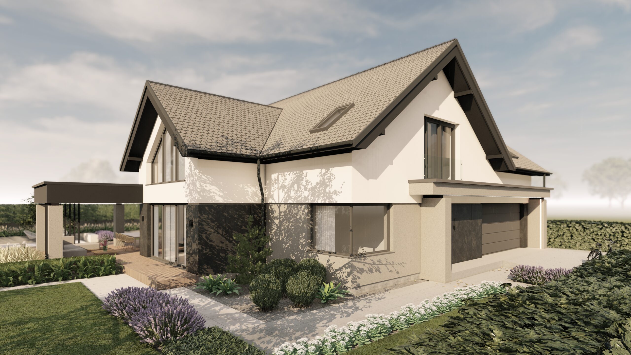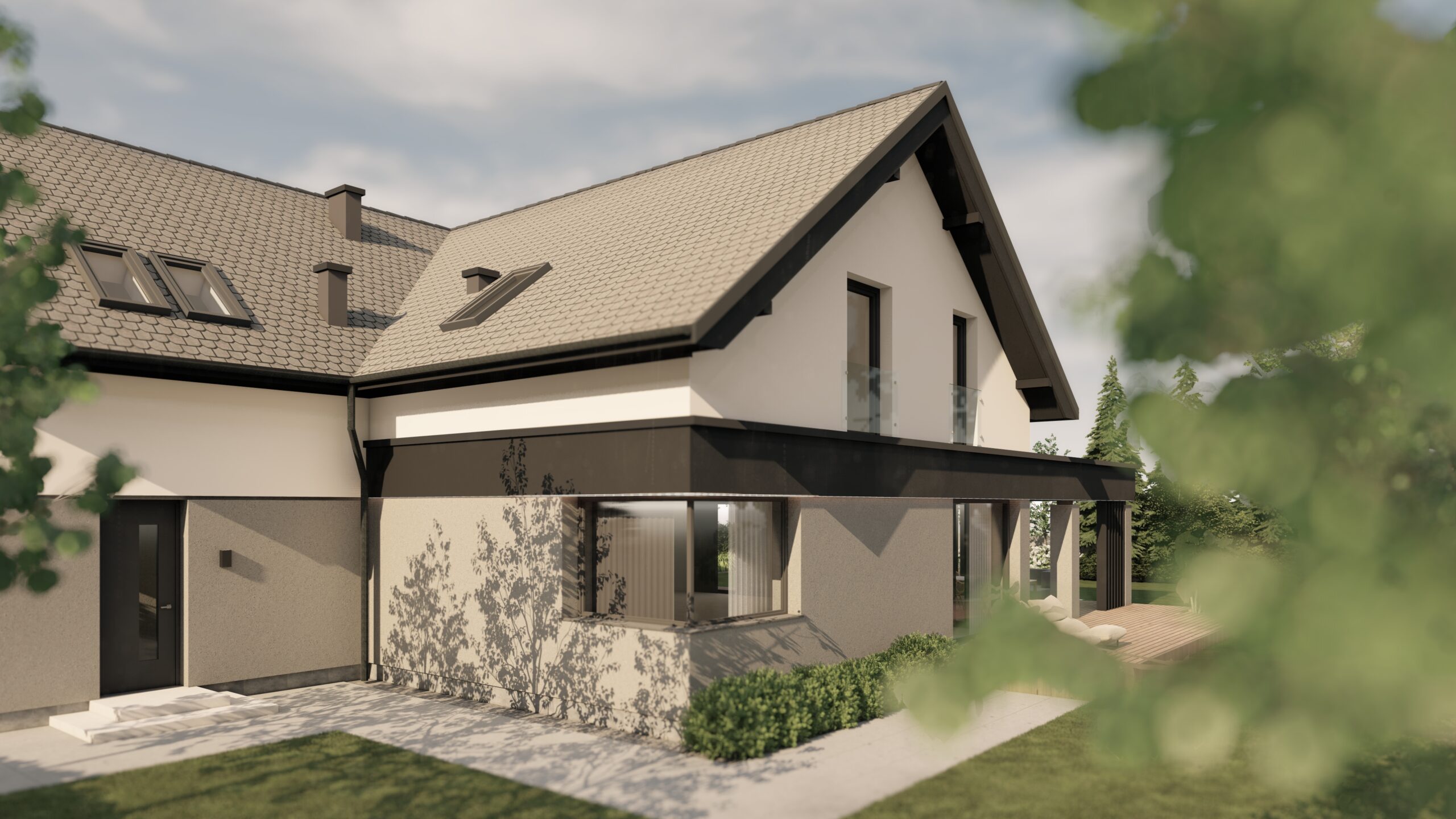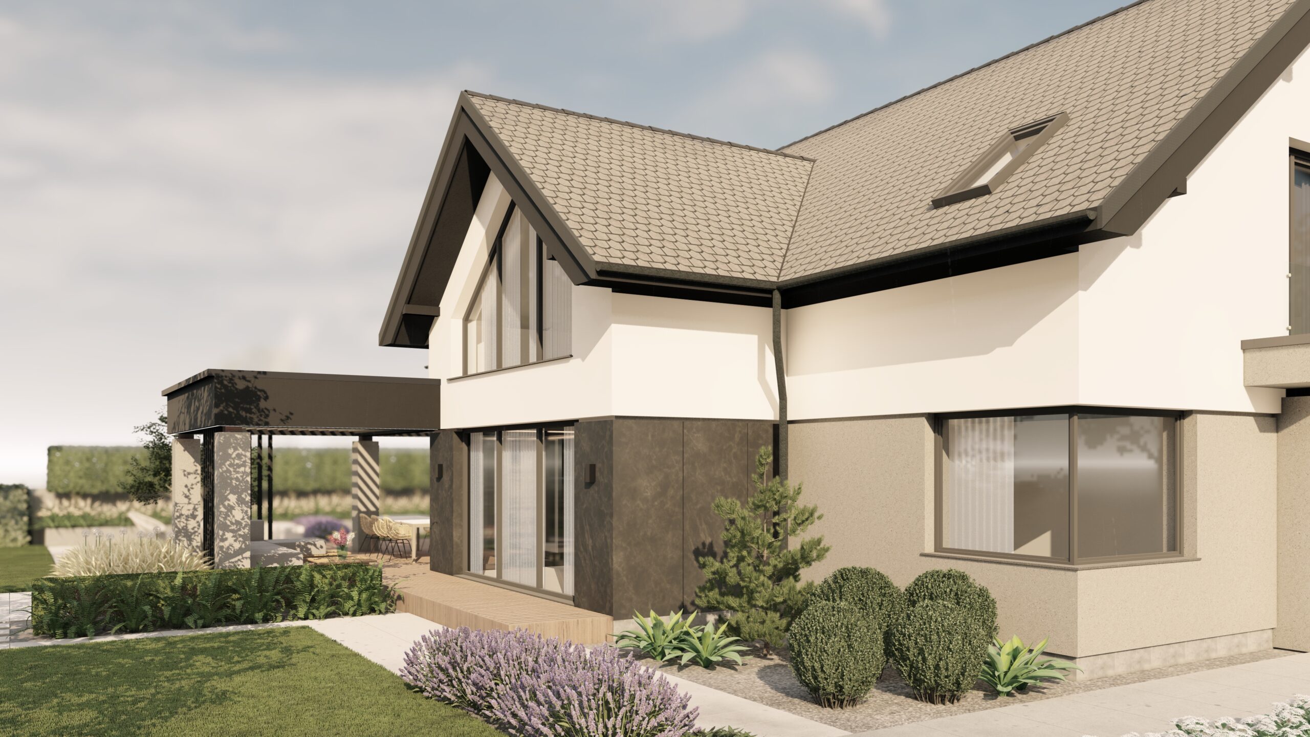 Elewacja domu jednorodzinnego, gdzie zastosowano wyraźny podział kondygnacji. Na pierwszej z nich dominuje jasnoszary tynk, na drugiej biały. Między nimi wprowadzono delikatne boniowanie, podkreślając tym samym linie okien i drzwi. Spiek kwarcowy w strefie wejściowej oraz wystającej części budynku stanowi dodatkowy detal dekoracyjny. Lewitujące słupy w strefie wejściowej i tarasie dodają lekkości zadaszeniom, tworząc doskonałą harmonię z bryłą budynku.