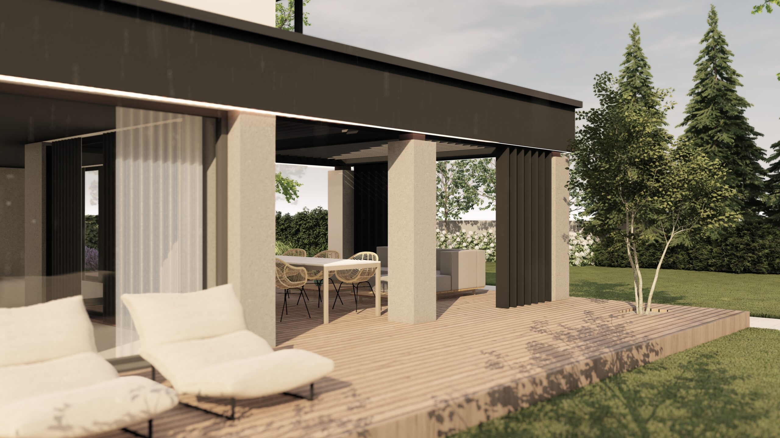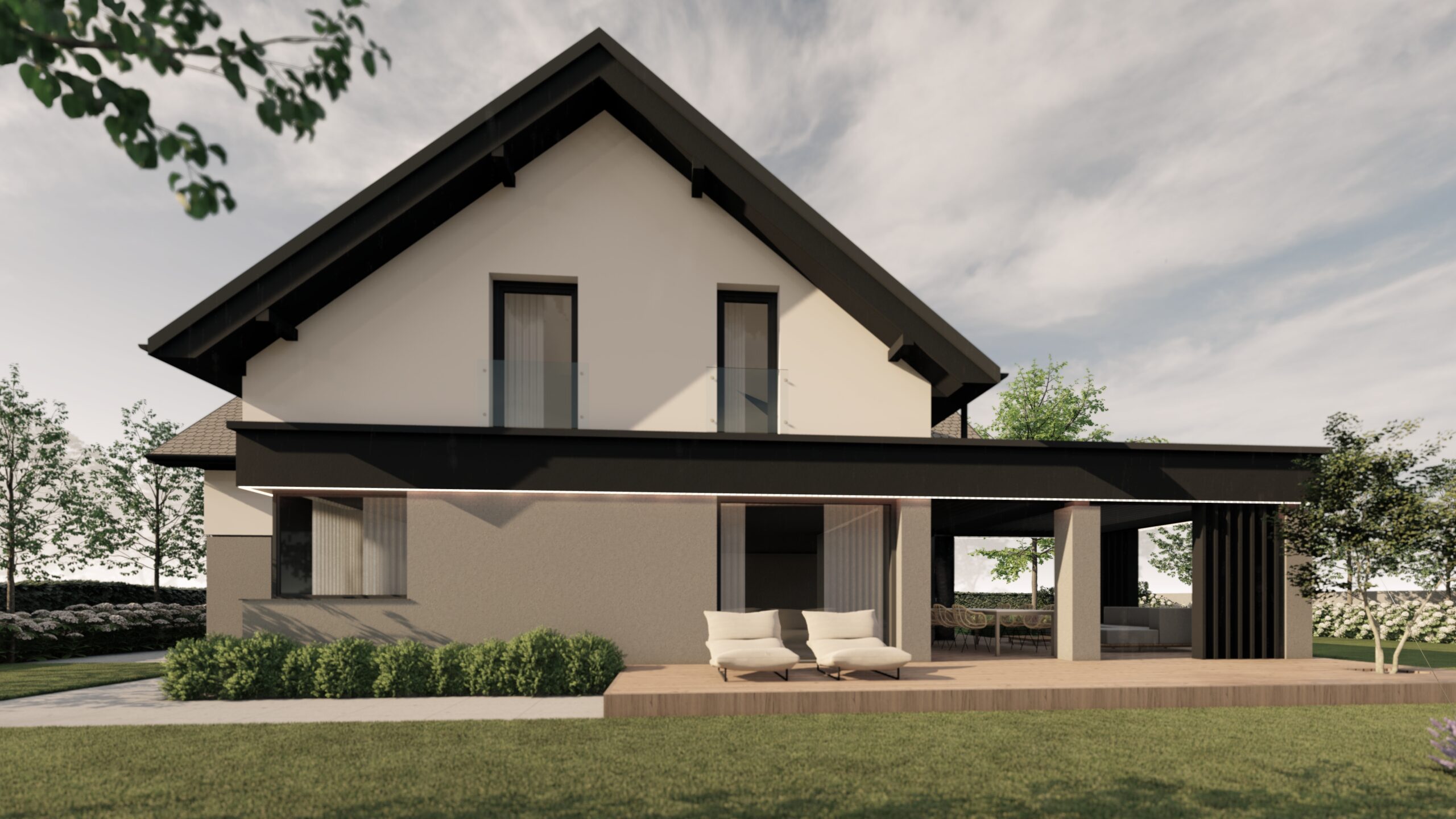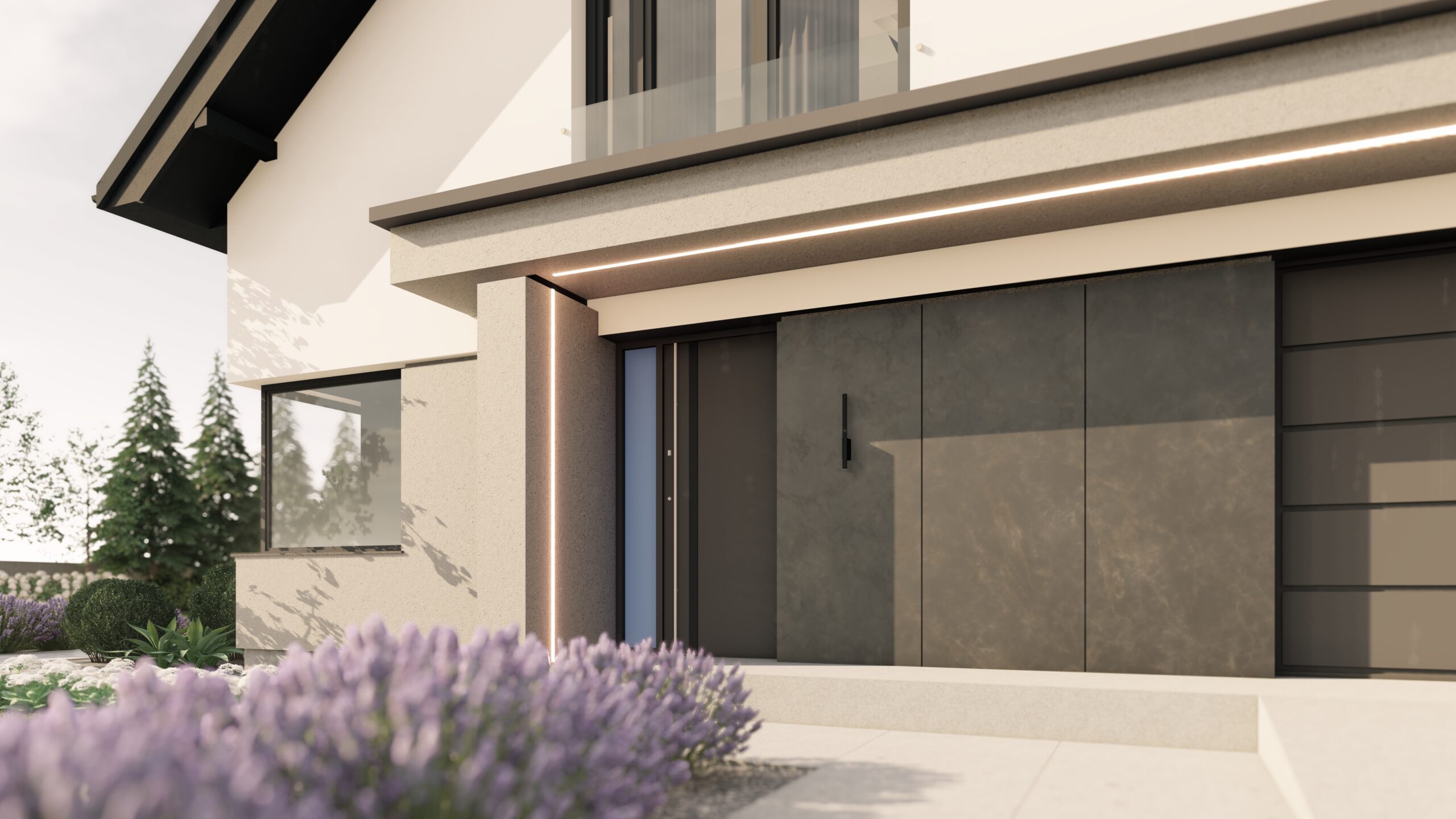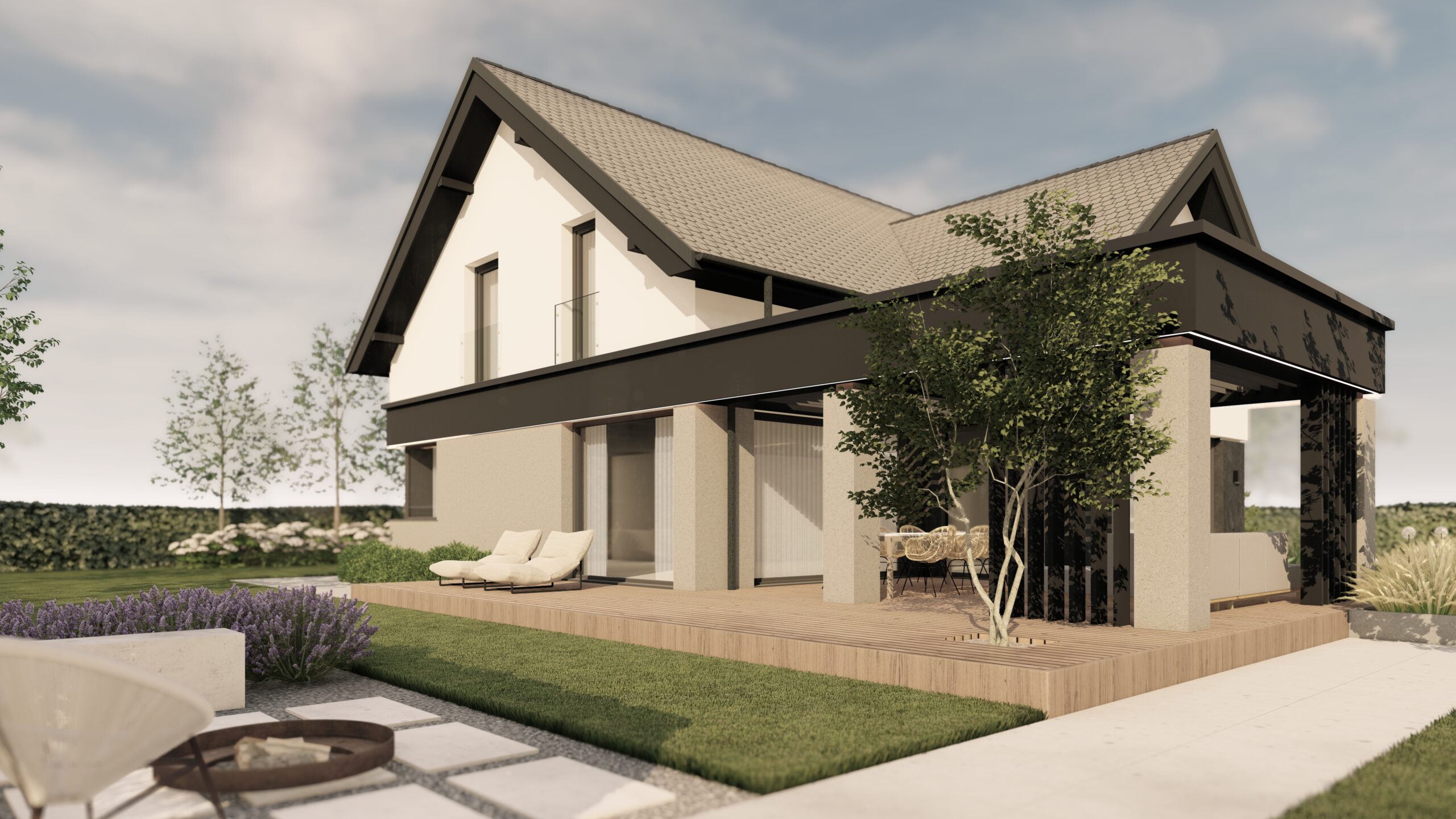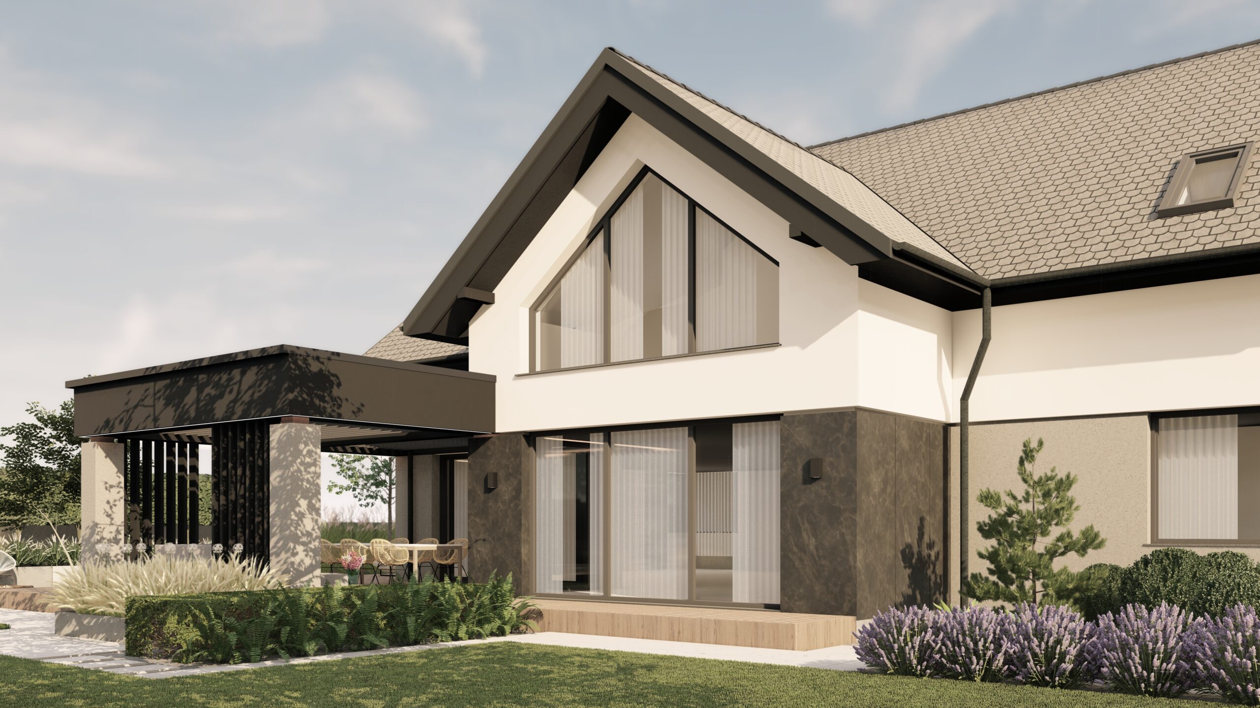 Elewacja domu jednorodzinnego, gdzie zastosowano wyraźny podział kondygnacji. Na pierwszej z nich dominuje jasnoszary tynk, na drugiej biały. Między nimi wprowadzono delikatne boniowanie, podkreślając tym samym linie okien i drzwi. Spiek kwarcowy w strefie wejściowej oraz wystającej części budynku stanowi dodatkowy detal dekoracyjny. Lewitujące słupy w strefie wejściowej i tarasie dodają lekkości zadaszeniom, tworząc doskonałą harmonię z bryłą budynku.