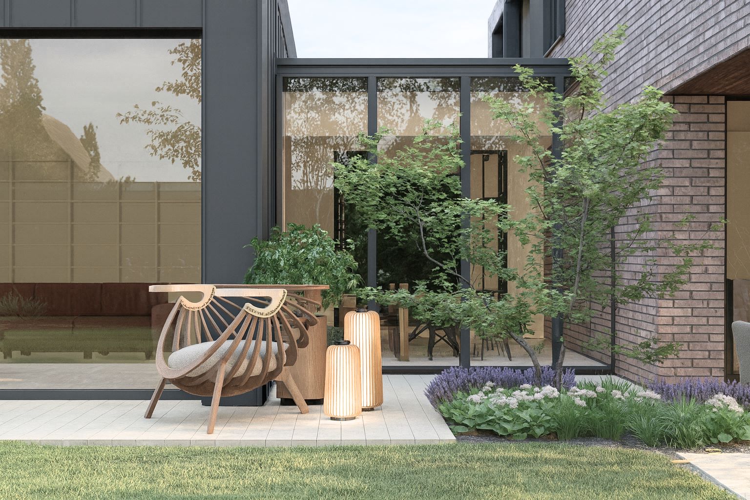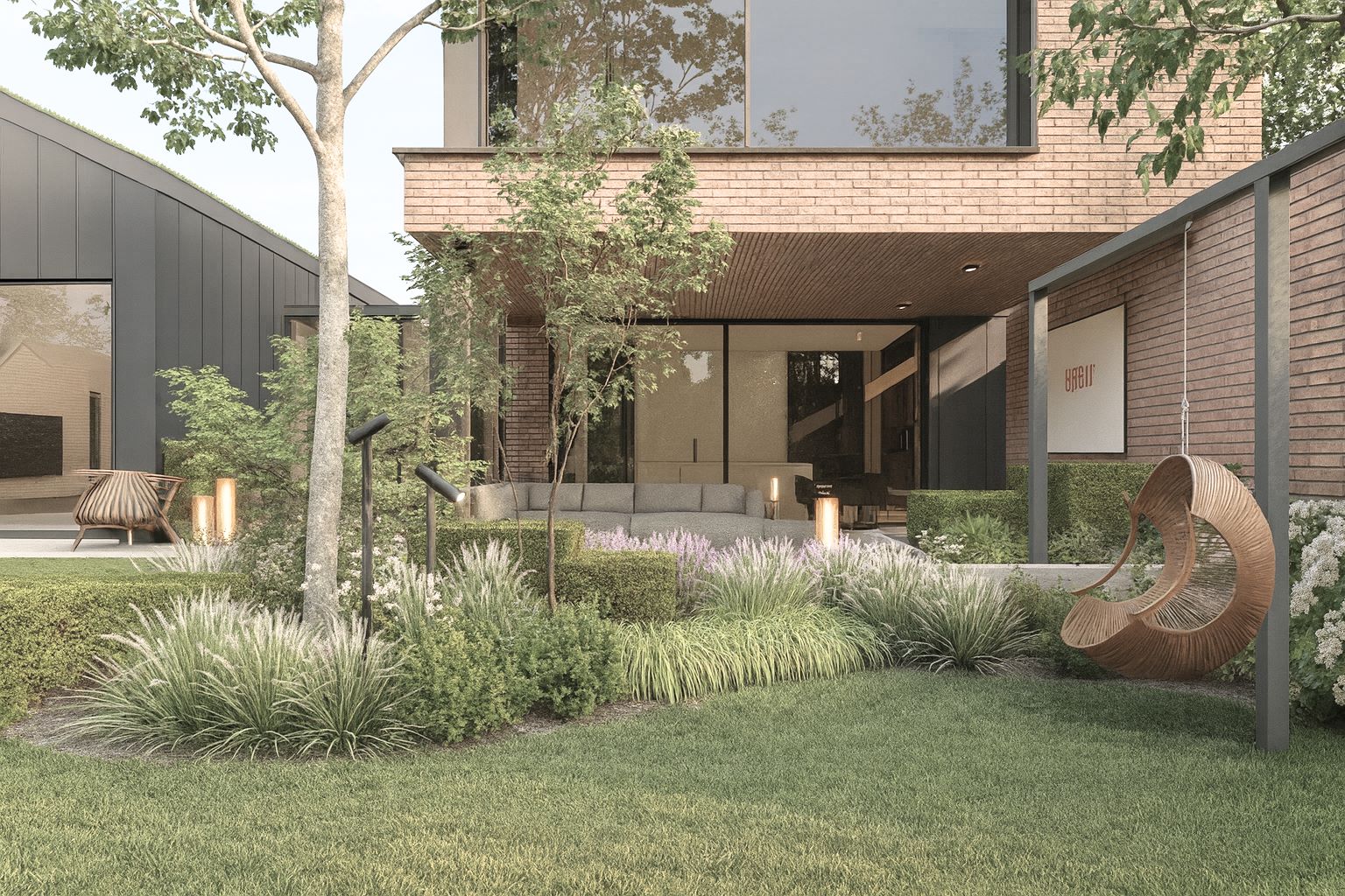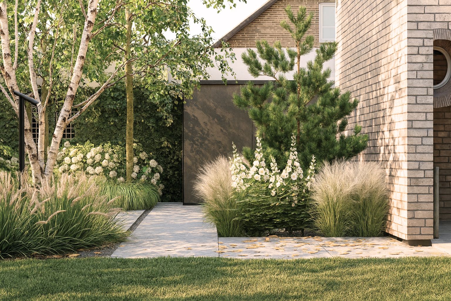 Najbardziej reprezentacyjnym elementem jest patio widoczne z wnętrza domu, z dwiema delikatnie wyniesionymi rabatami inspirowanymi ogrodami japońskimi. Roślinność ma charakter naturalistyczny- dominują zielenie przełamane żółciami, fioletami, bielą i różem, a jesienią ogród zyskuje złocisto-czerwone odcienie.