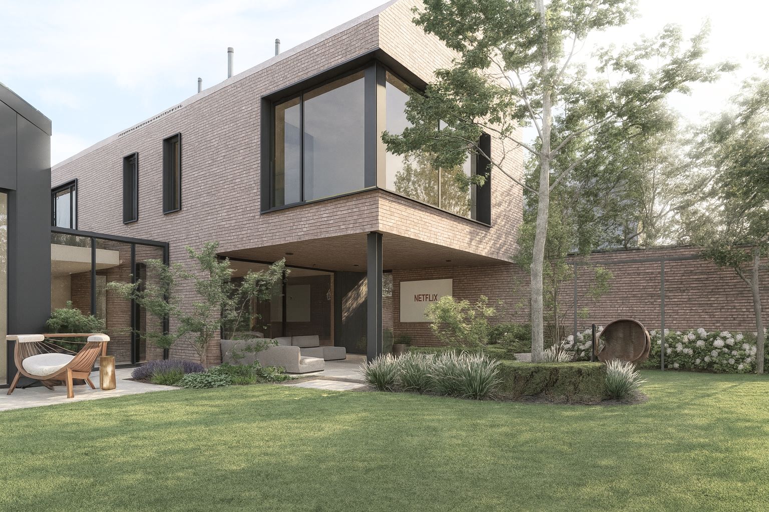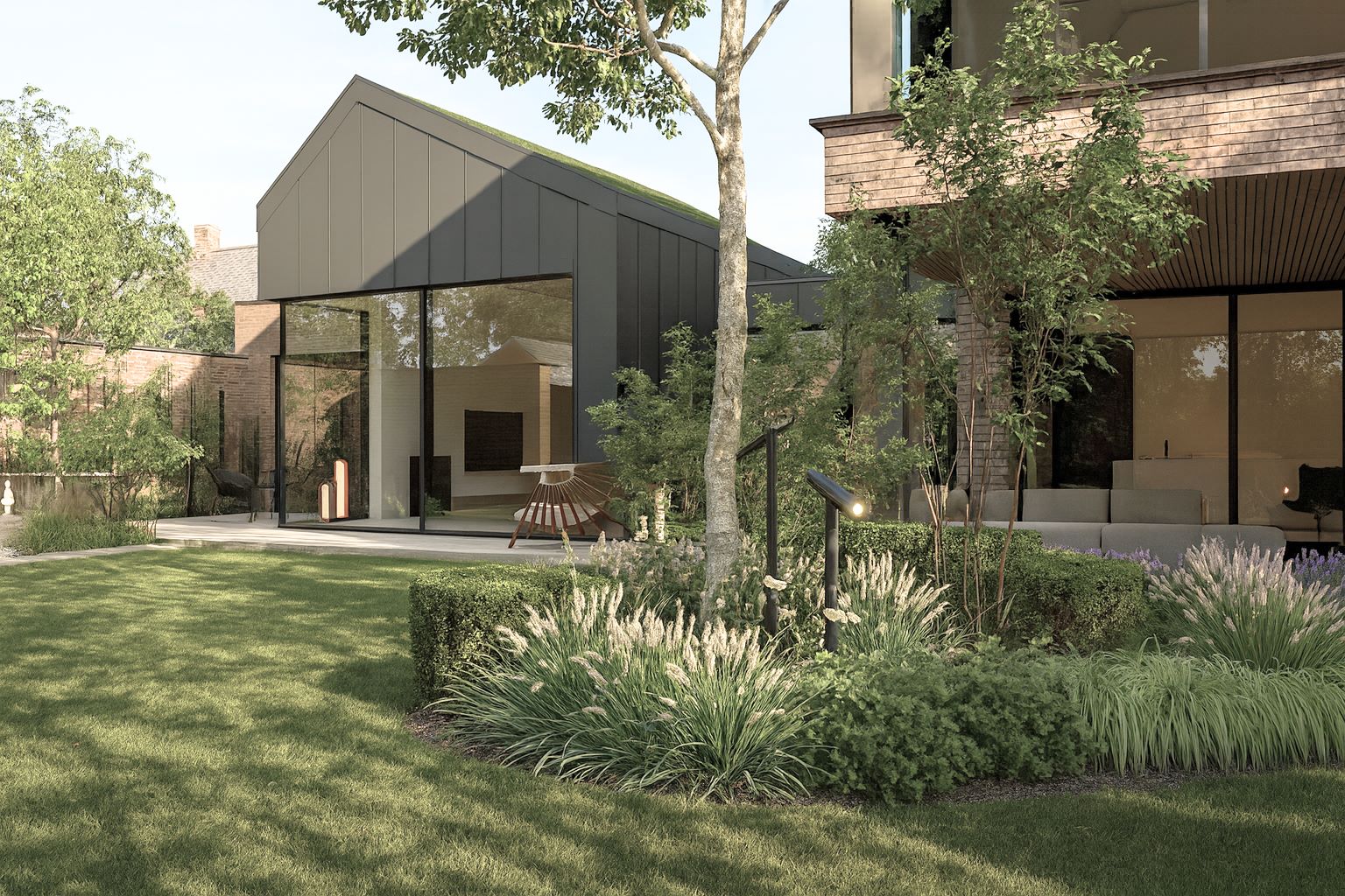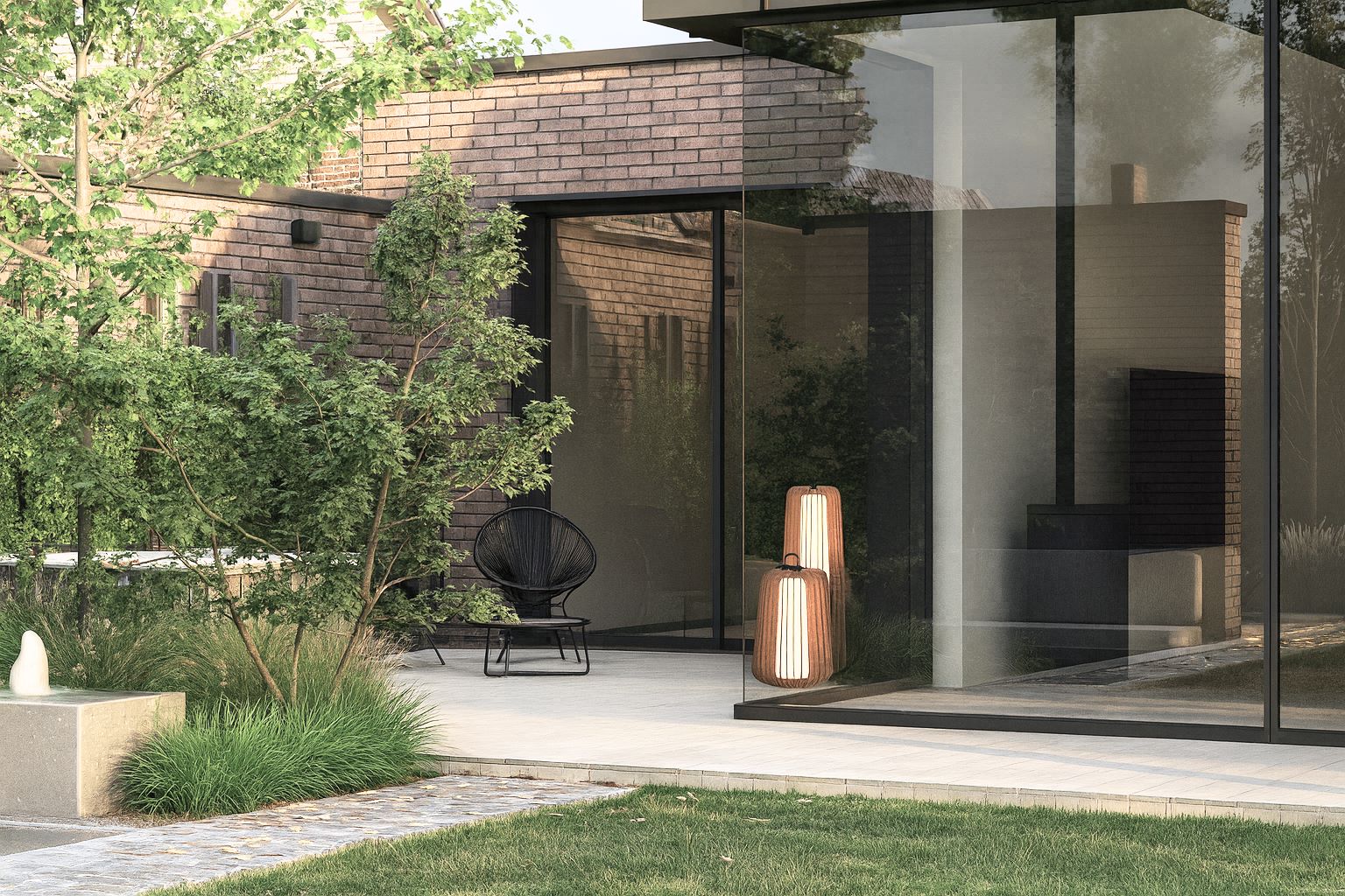 Najbardziej reprezentacyjnym elementem jest patio widoczne z wnętrza domu, z dwiema delikatnie wyniesionymi rabatami inspirowanymi ogrodami japońskimi. Roślinność ma charakter naturalistyczny- dominują zielenie przełamane żółciami, fioletami, bielą i różem, a jesienią ogród zyskuje złocisto-czerwone odcienie.