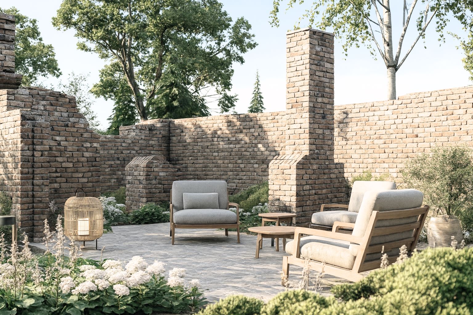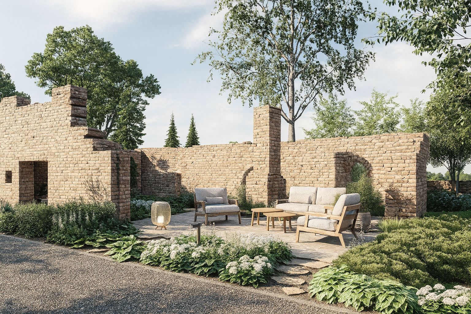 • Ruiny starego budynku- zachowane i wyeksponowane jako malowniczy akcent, stanowiący integralną część ogrodu.