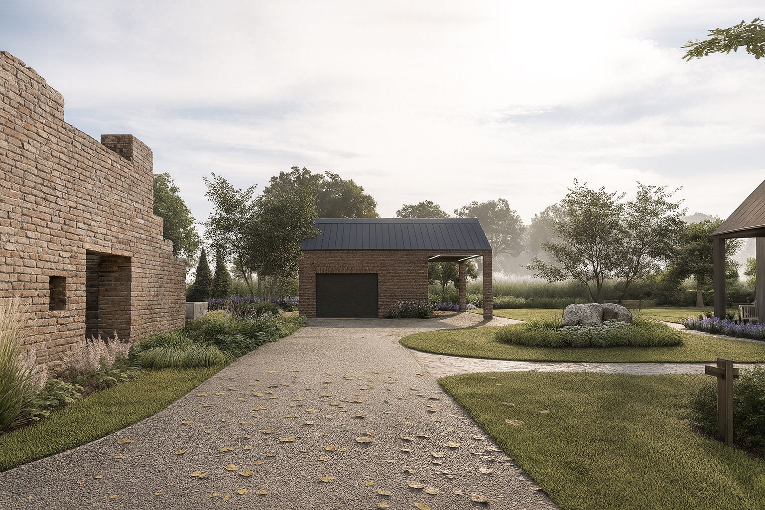Ważnym elementem założenia jest palenisko, pełniące funkcję zarówno dekoracyjną, jak i użytkową. Do strefy wejściowej prowadzi obszerny podjazd o nawierzchni mineralnej, który porządkuje przestrzeń i naturalnie łączy się z charakterem całego założenia.