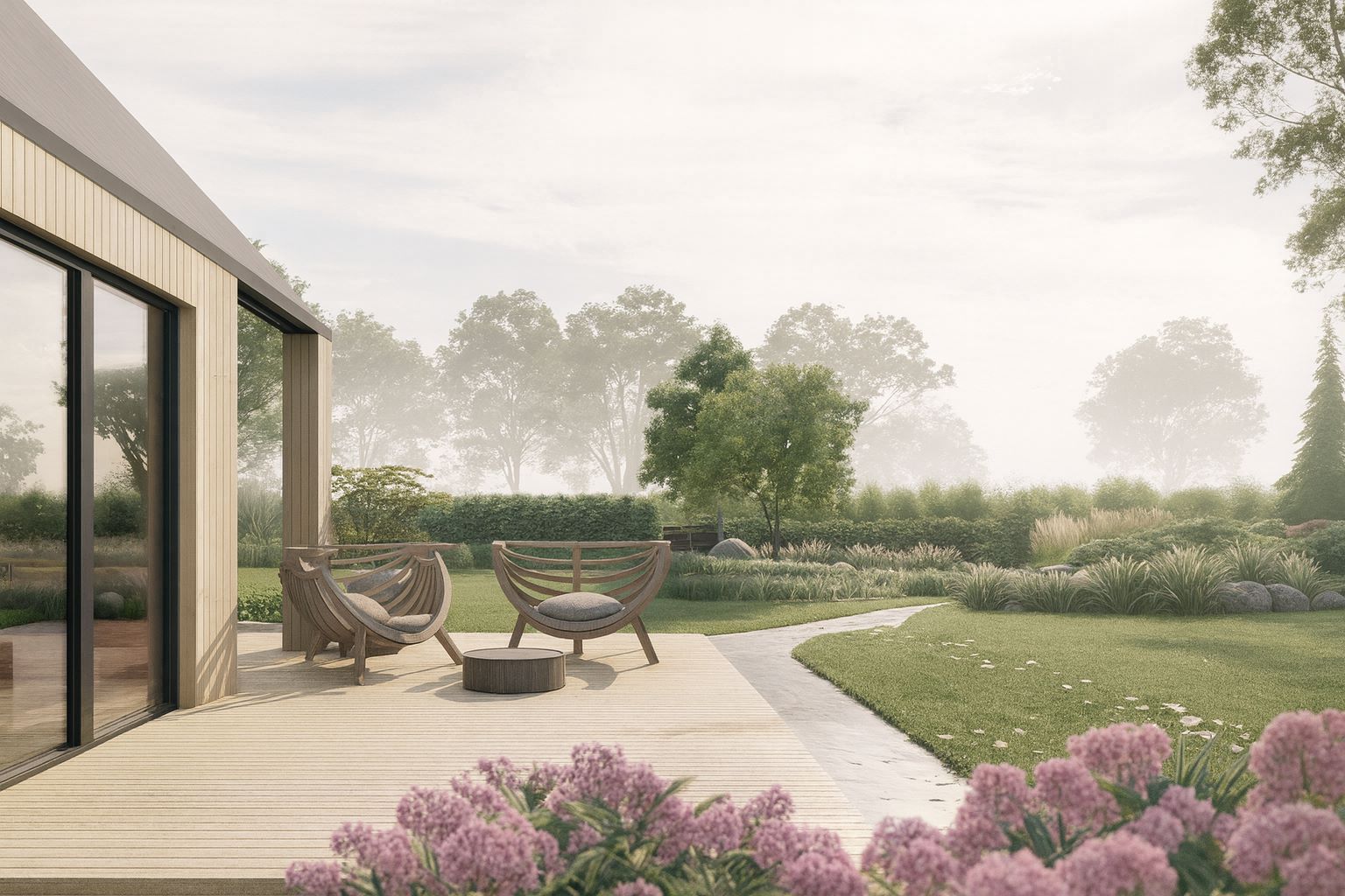 Ogród utrzymany jest w miękkiej, płynnej stylistyce. Naturalnie zróżnicowane wysokości terenu i wielowarstwowe nasadzenia drzew, krzewów, bylin i traw ozdobnych budują sielski, swobodny rytm roślinny.