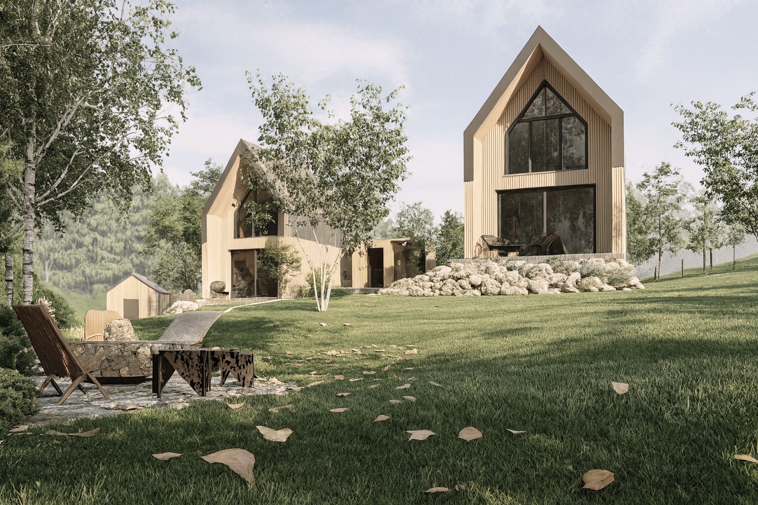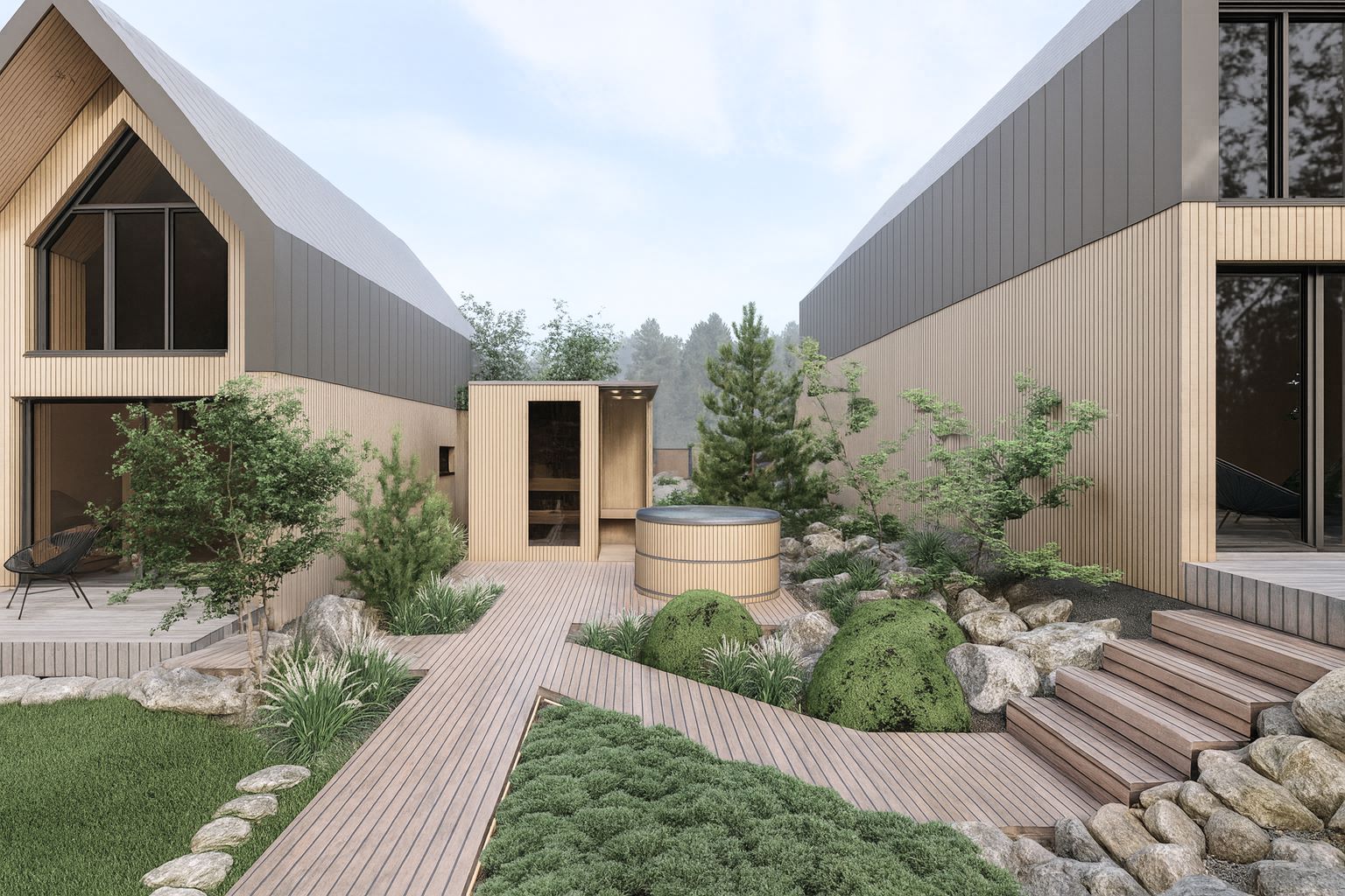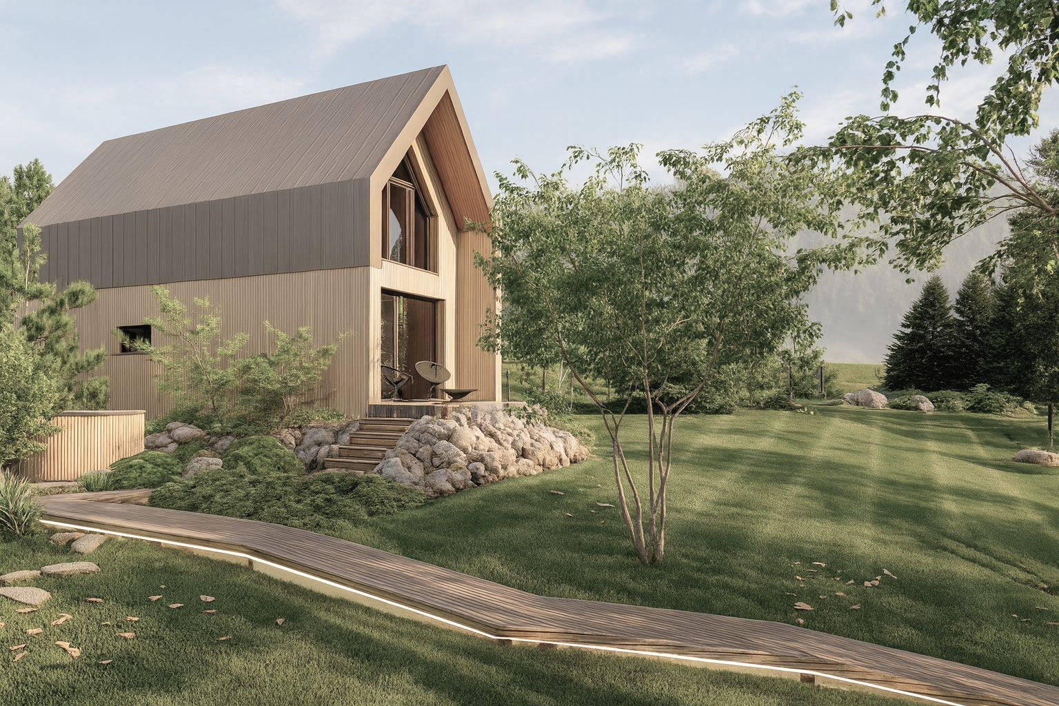 Pięknie położona, górska działka została zaprojektowana z myślą o maksymalnym komforcie i relaksie odwiedzających gości. Naturalne ukształtowanie terenu oraz otaczający las stały się inspiracją do stworzenia funkcjonalnej i harmonijnej przestrzeni.