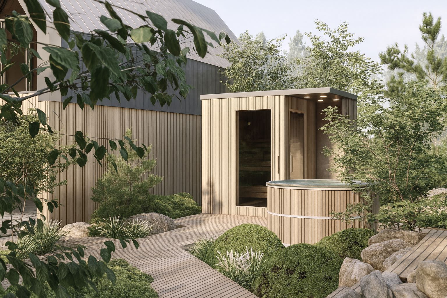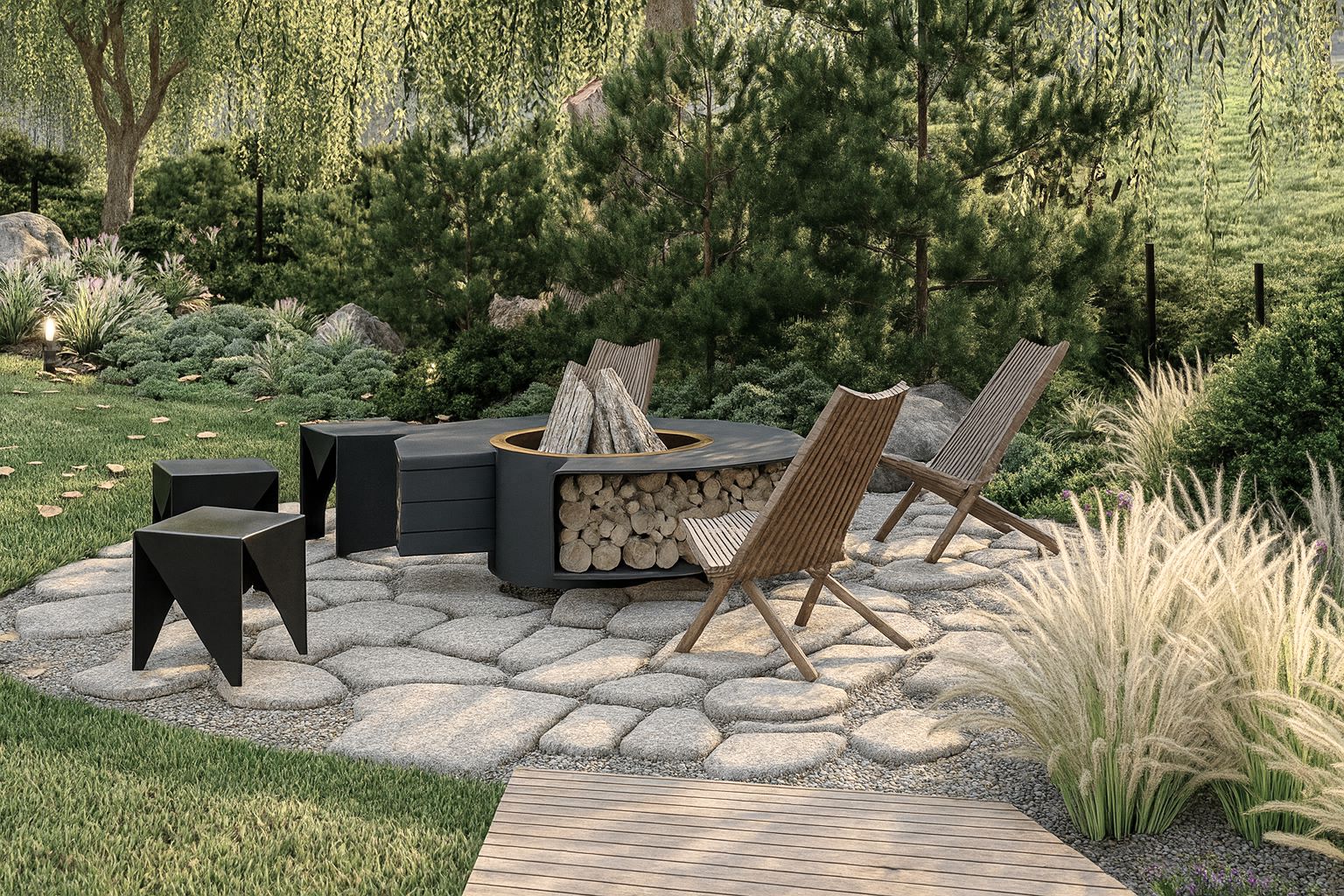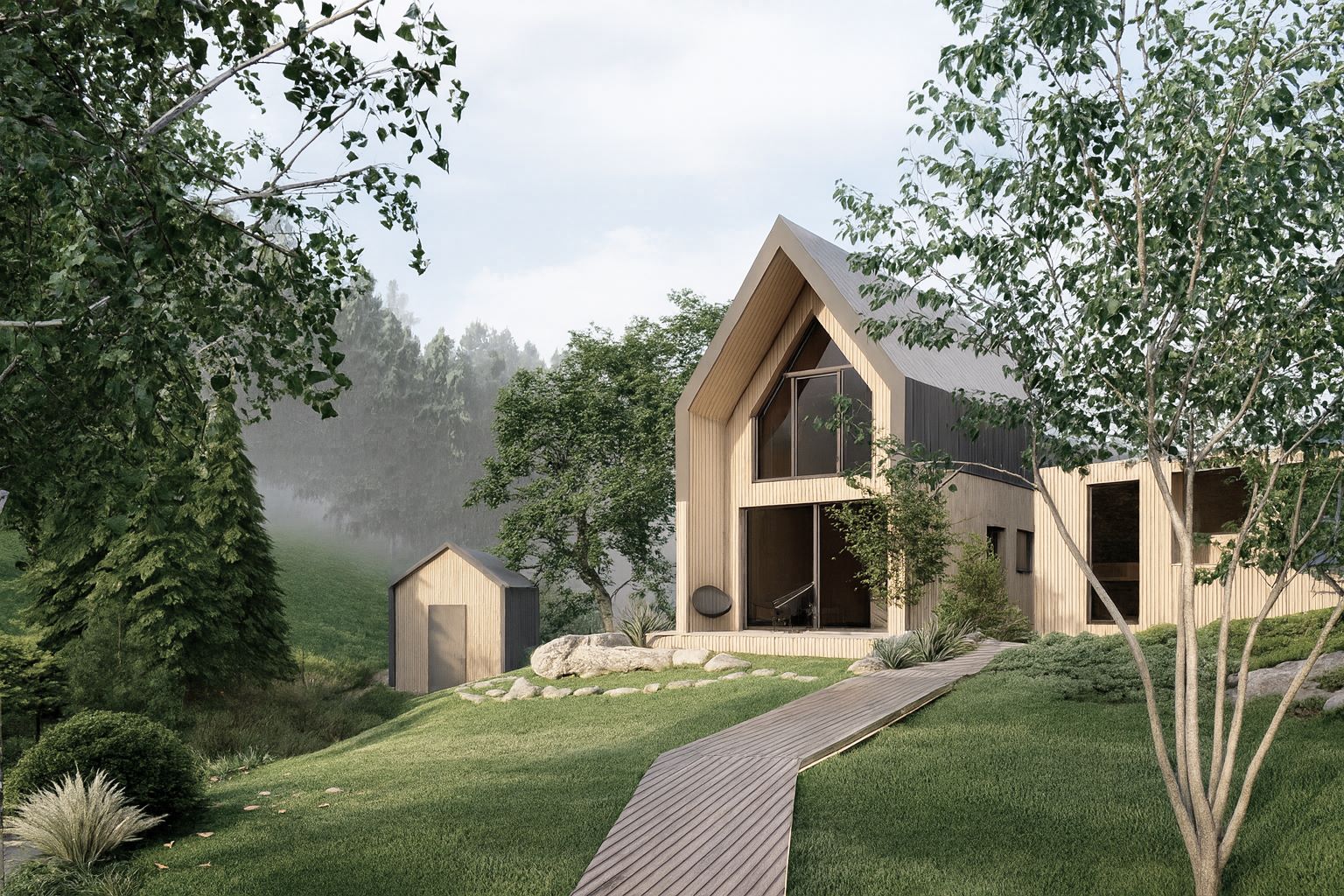 Pięknie położona, górska działka została zaprojektowana z myślą o maksymalnym komforcie i relaksie odwiedzających gości. Naturalne ukształtowanie terenu oraz otaczający las stały się inspiracją do stworzenia funkcjonalnej i harmonijnej przestrzeni.