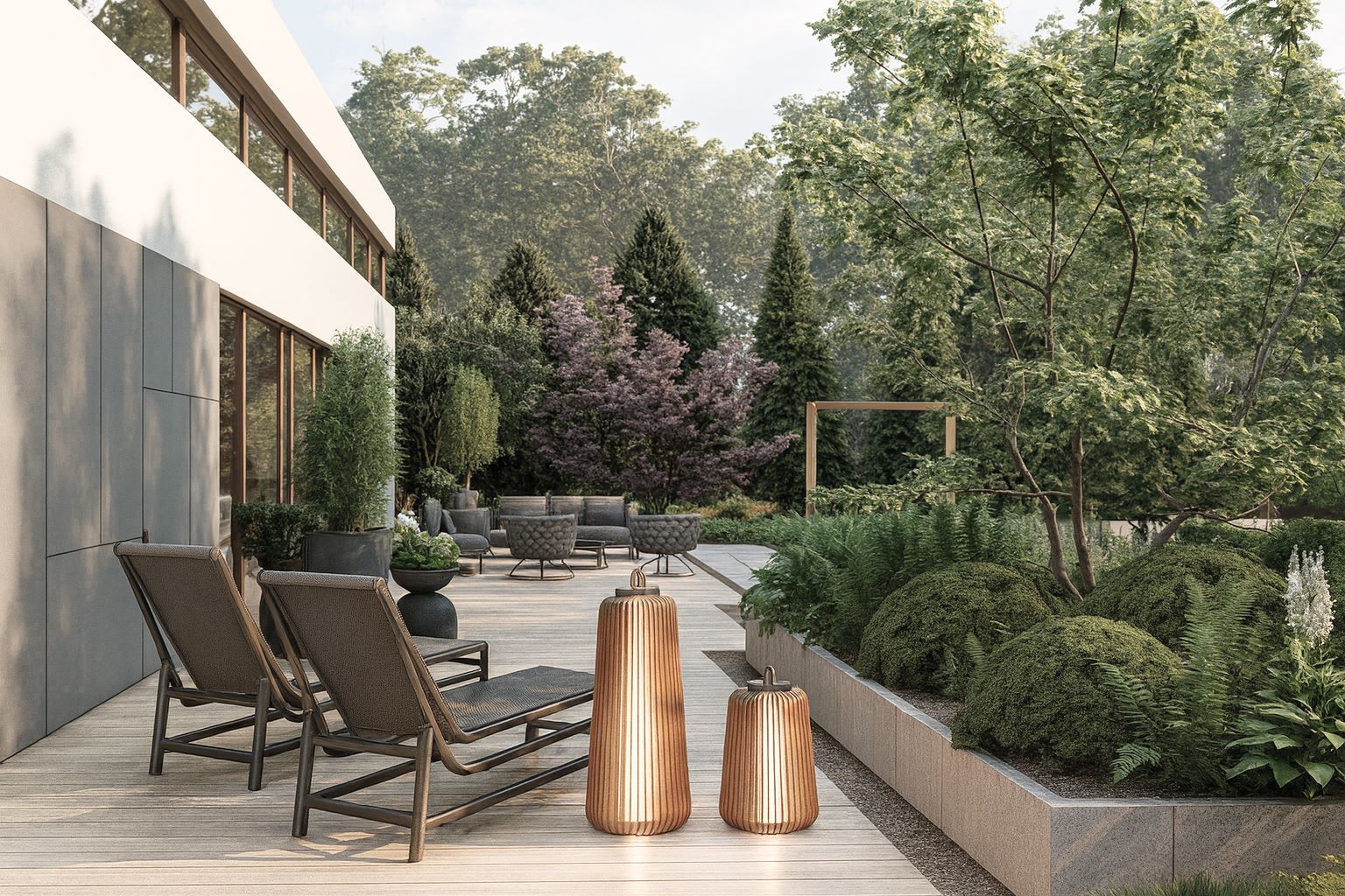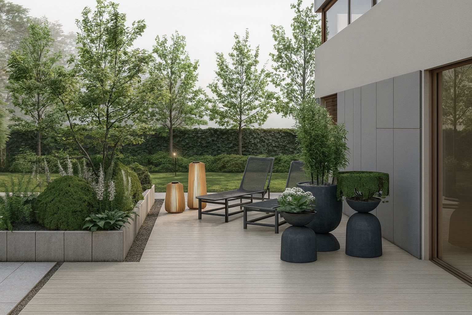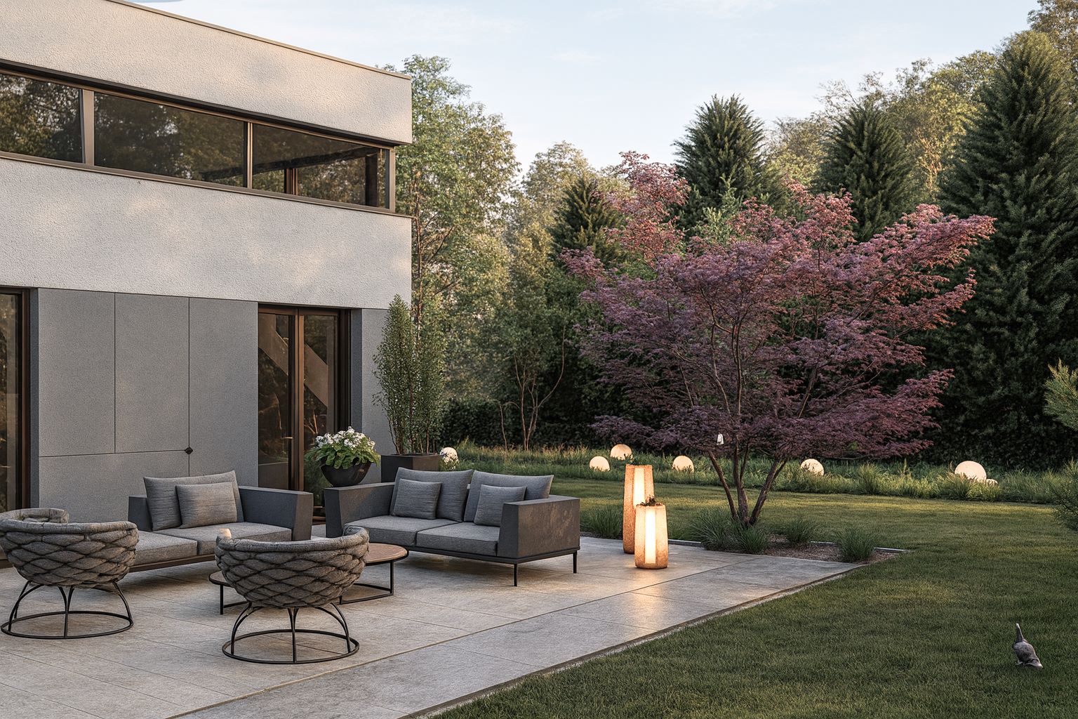 Całość dopełnia subtelne oświetlenie, które po zmroku podkreśla najważniejsze elementy kompozycji i tworzy przytulny klimat.