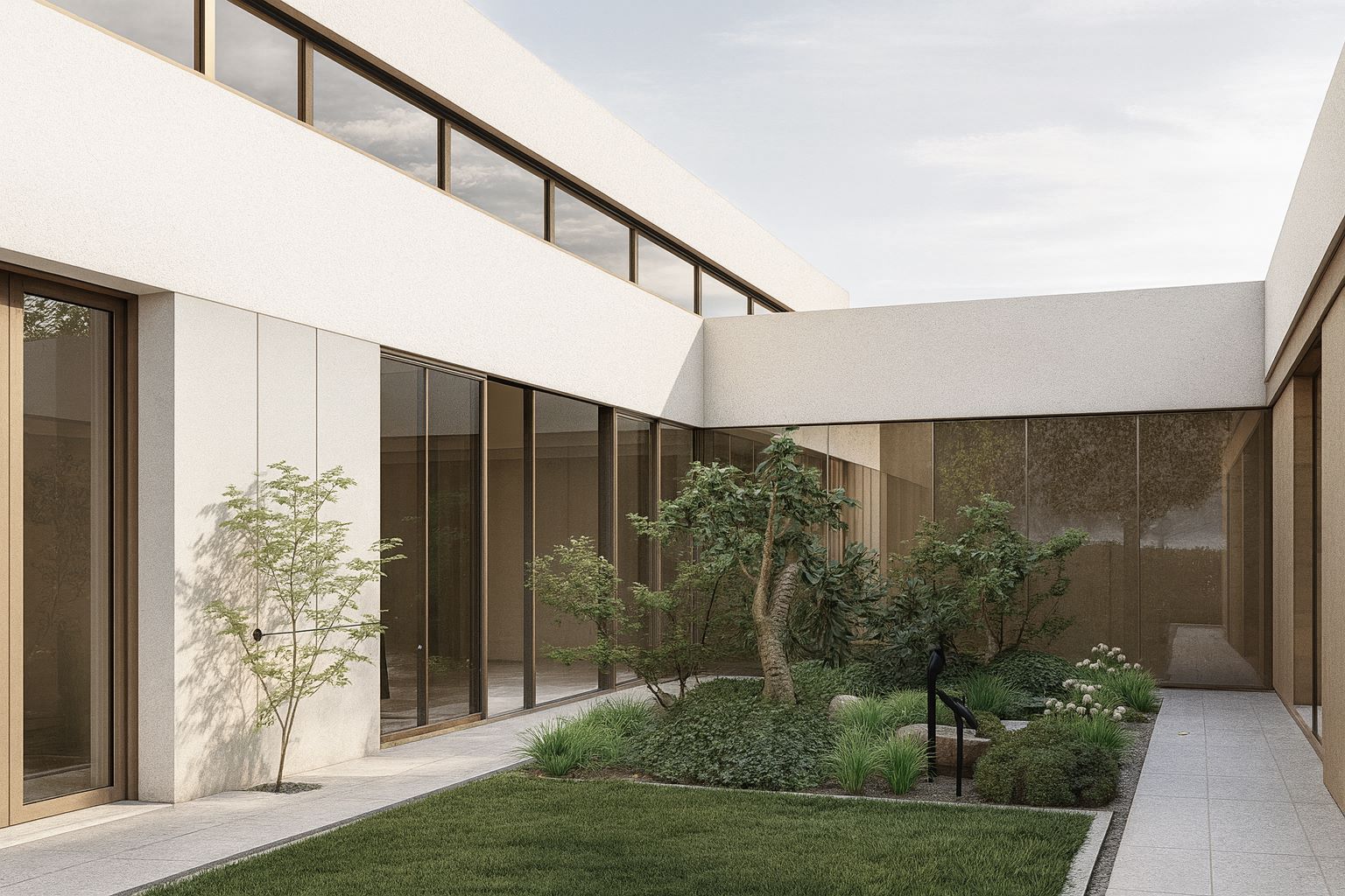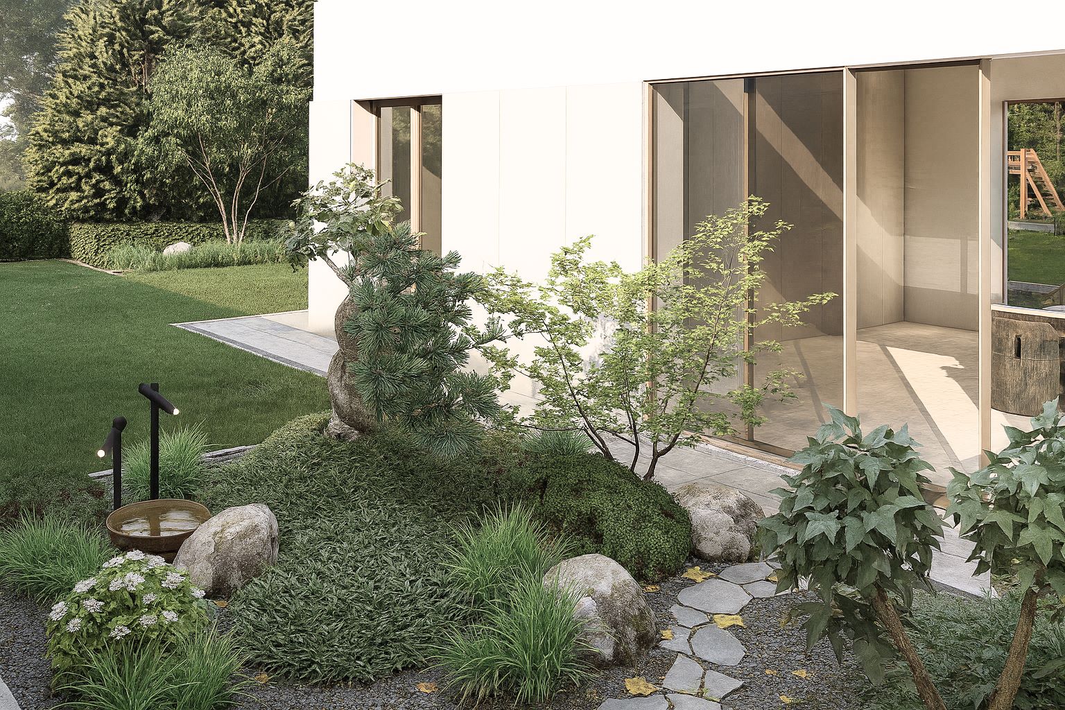 Najważniejszym elementem całego założenia jest patio widoczne z okien domu- atrakcyjna wizualnie przestrzeń z dwoma wyniesieniami obsadzonymi efektownymi roślinami, m.in. gatunkami inspirowanymi ogrodami japońskimi.