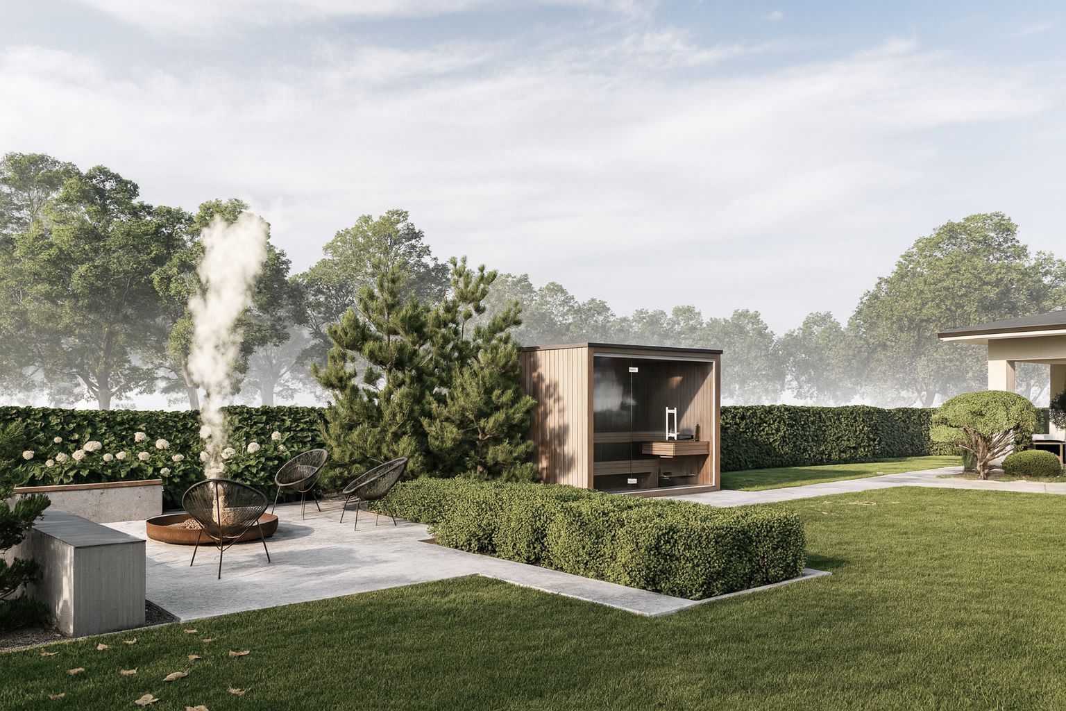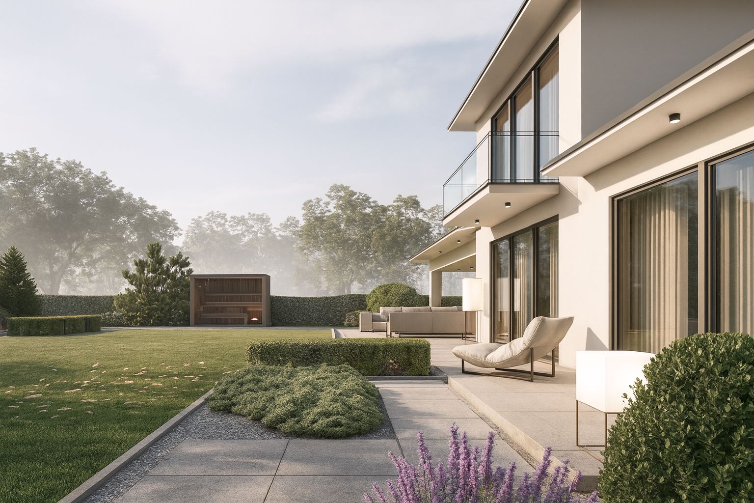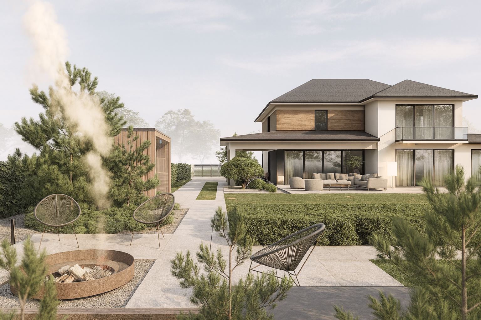 Ogród minimalistyczny o prostym układzie funkcjonalnym. Taras rozciągnięty na szerokość domu, gdzie wyznaczono 2 strefy. Pierwszą rekreacyjną, drugą z miejscem do spożywania posiłków. Układ komunikacyjny ogrodu wyznacza ciąg komunikacyjny łączący taras z sauną i strefą paleniska.