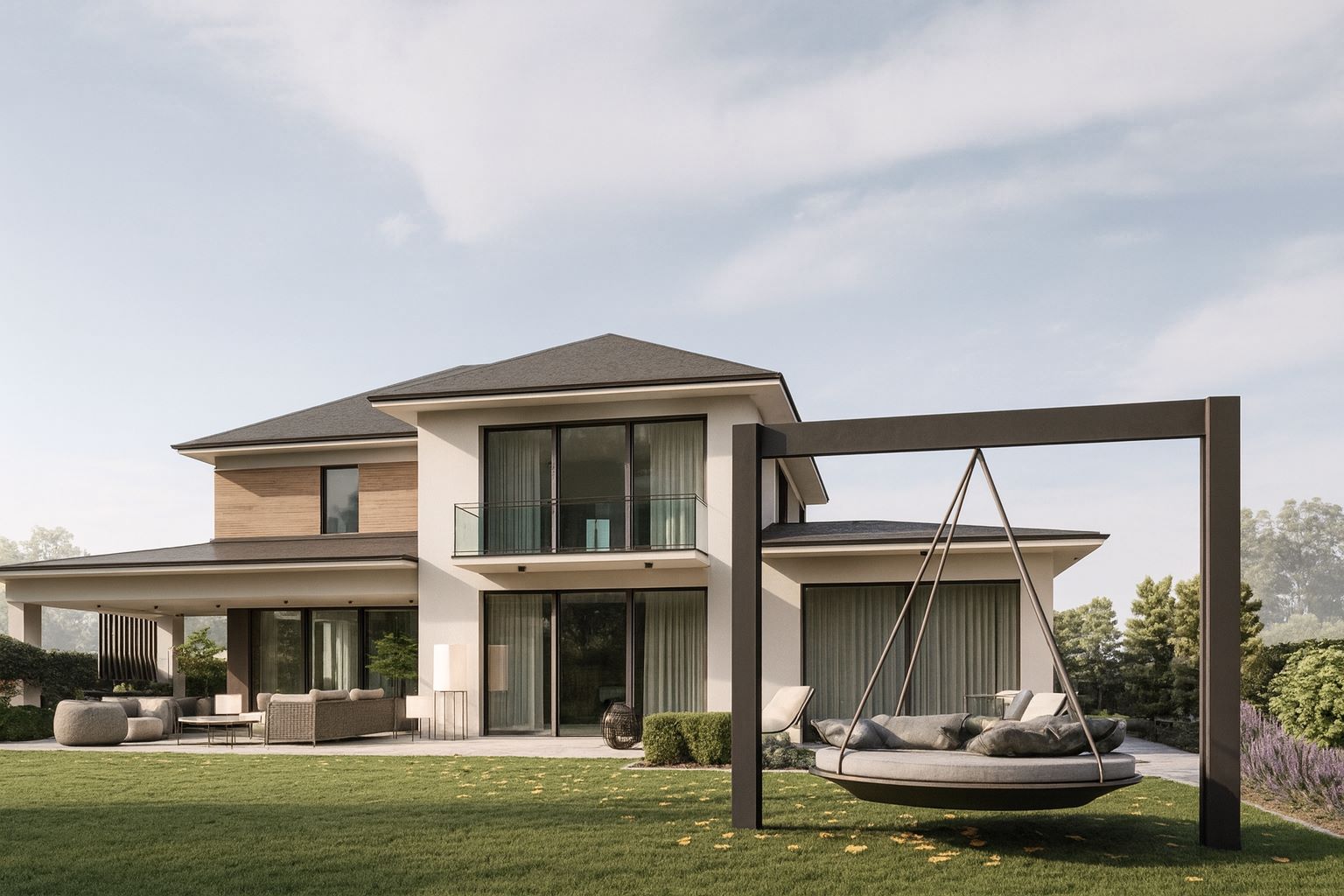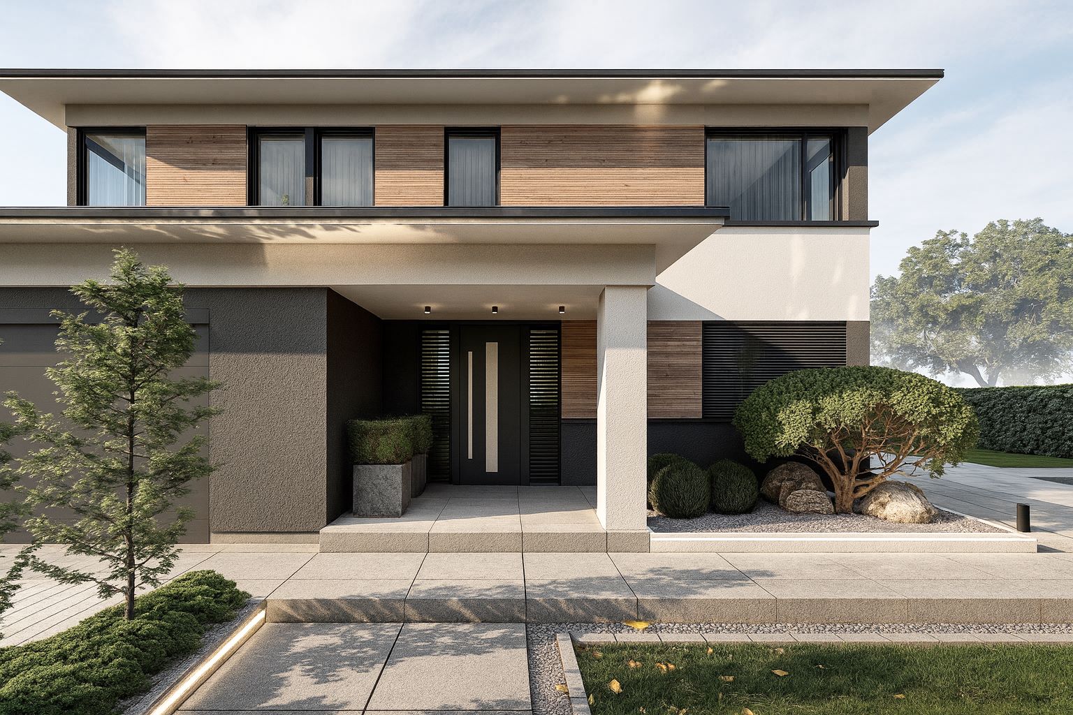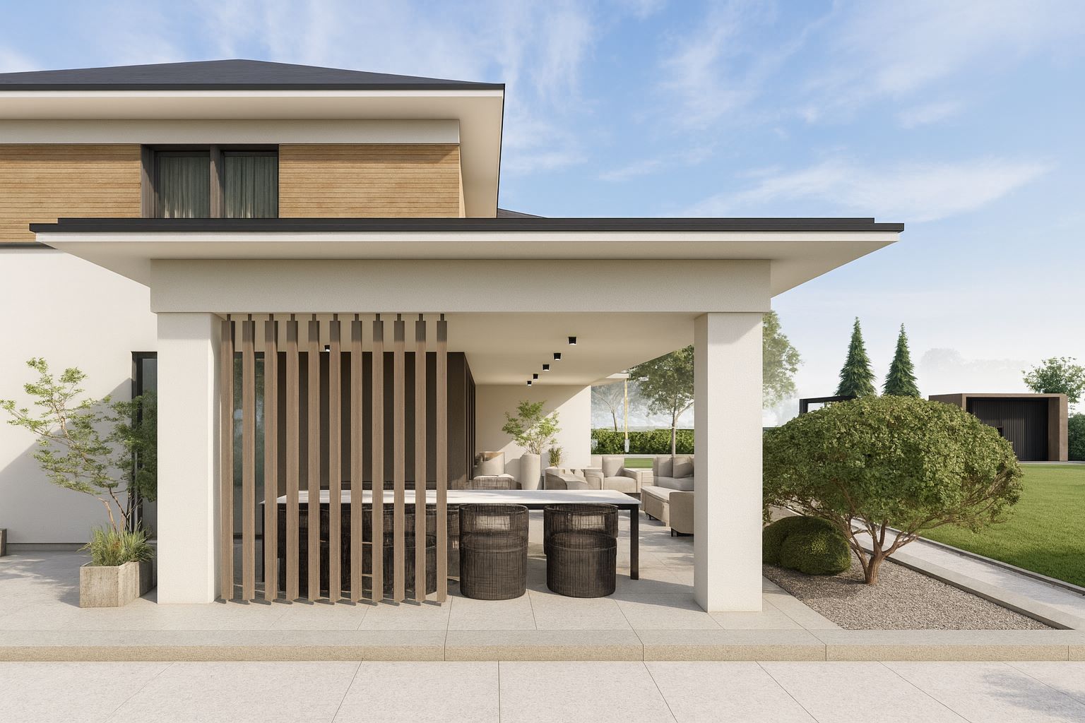 Po drugiej stronie znajduje się nowoczesny budynek gospodarczy ze strefą warzywno-owocową. Na życzenie inwestora nasadzenia w ogrodzie ograniczono do kilkunastu rodzajów roślin zimozielonych.