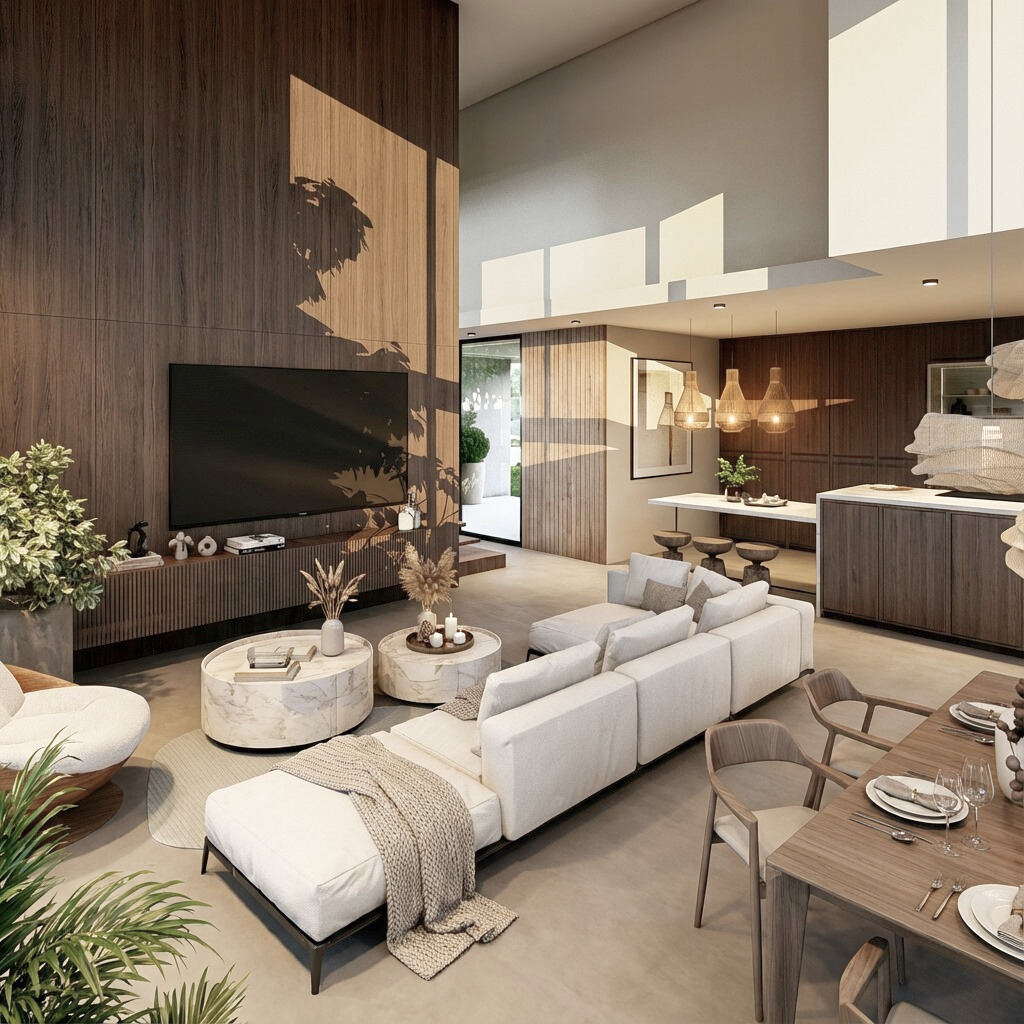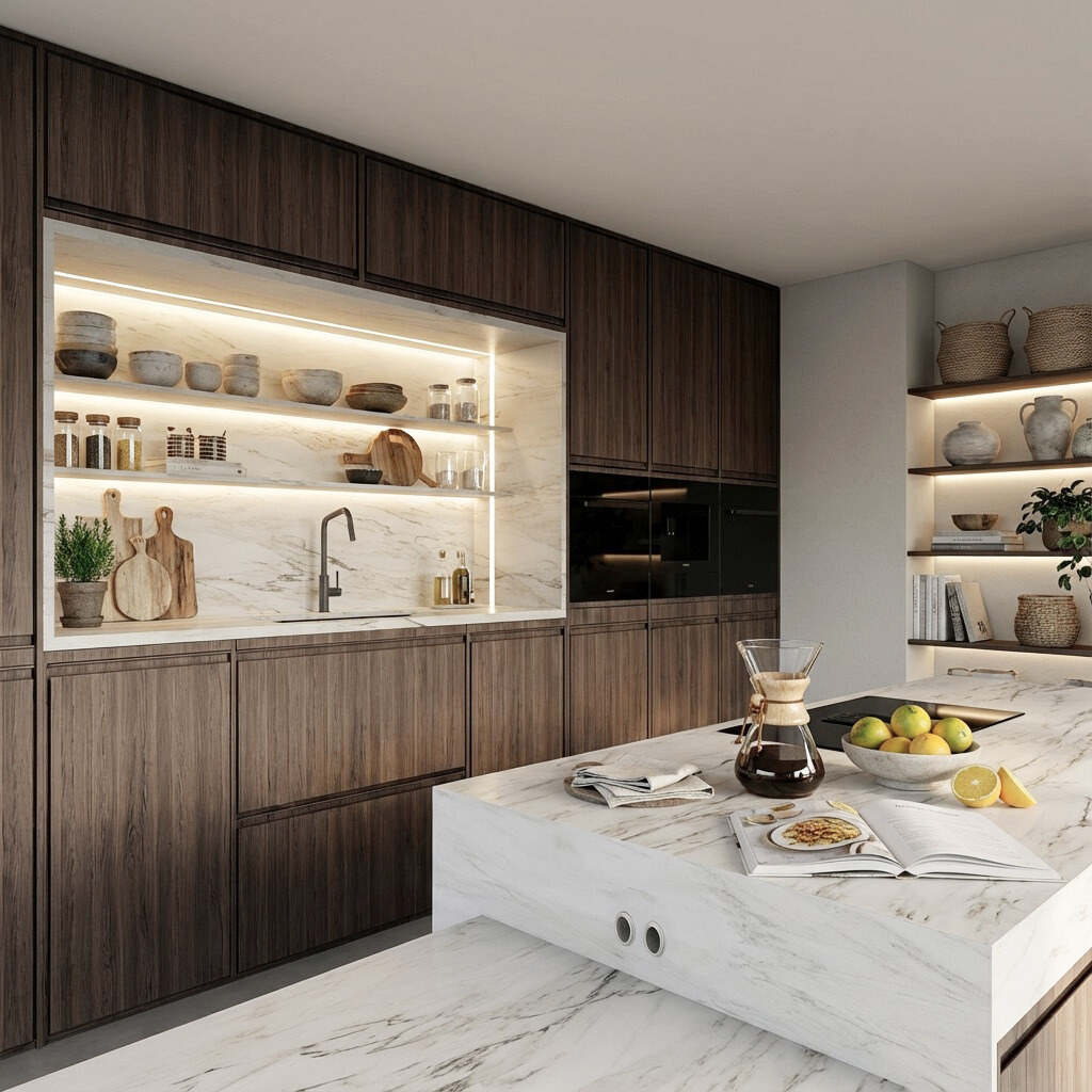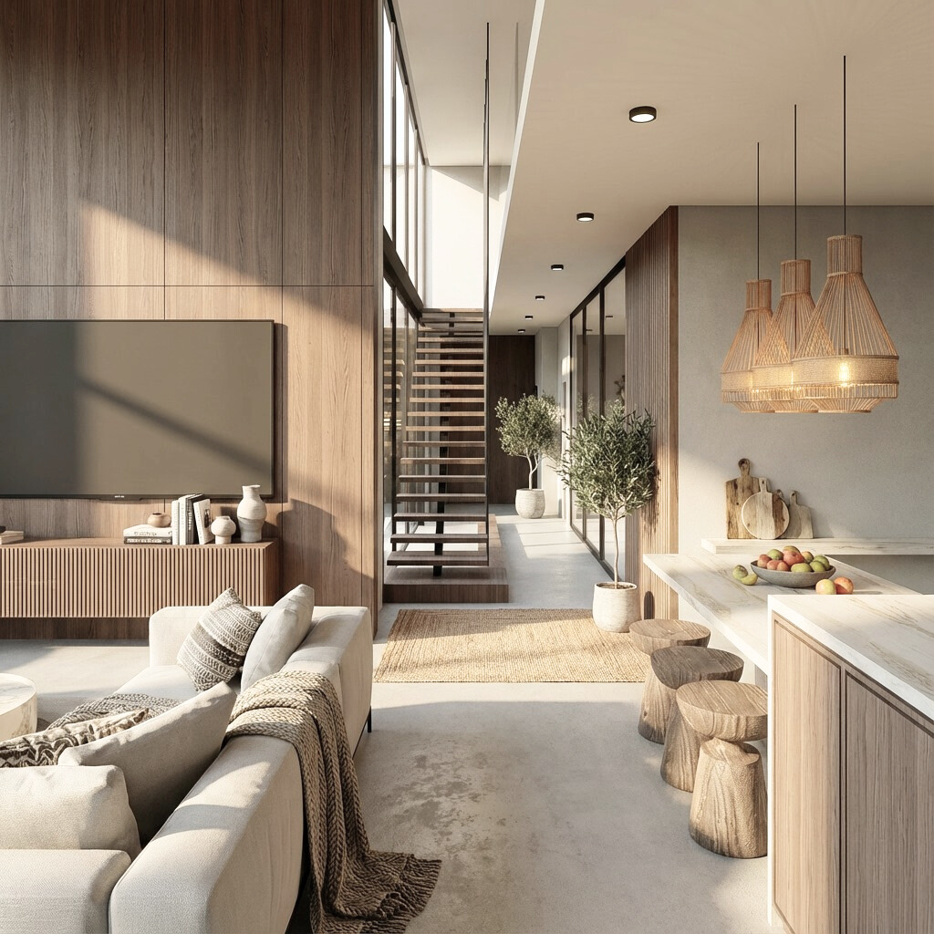 W projekcie dominują drewno w szlachetnym odcieniu orzecha, marmurowe i spiekowe powierzchnie, a także jasne, miękkie tkaniny które dodają wnętrzu przytulności. Subtelne akcenty organiczne- rattanowe lampy, naturalne dekoracje i zieleń, wprowadzają lekkość oraz domowy charakter.