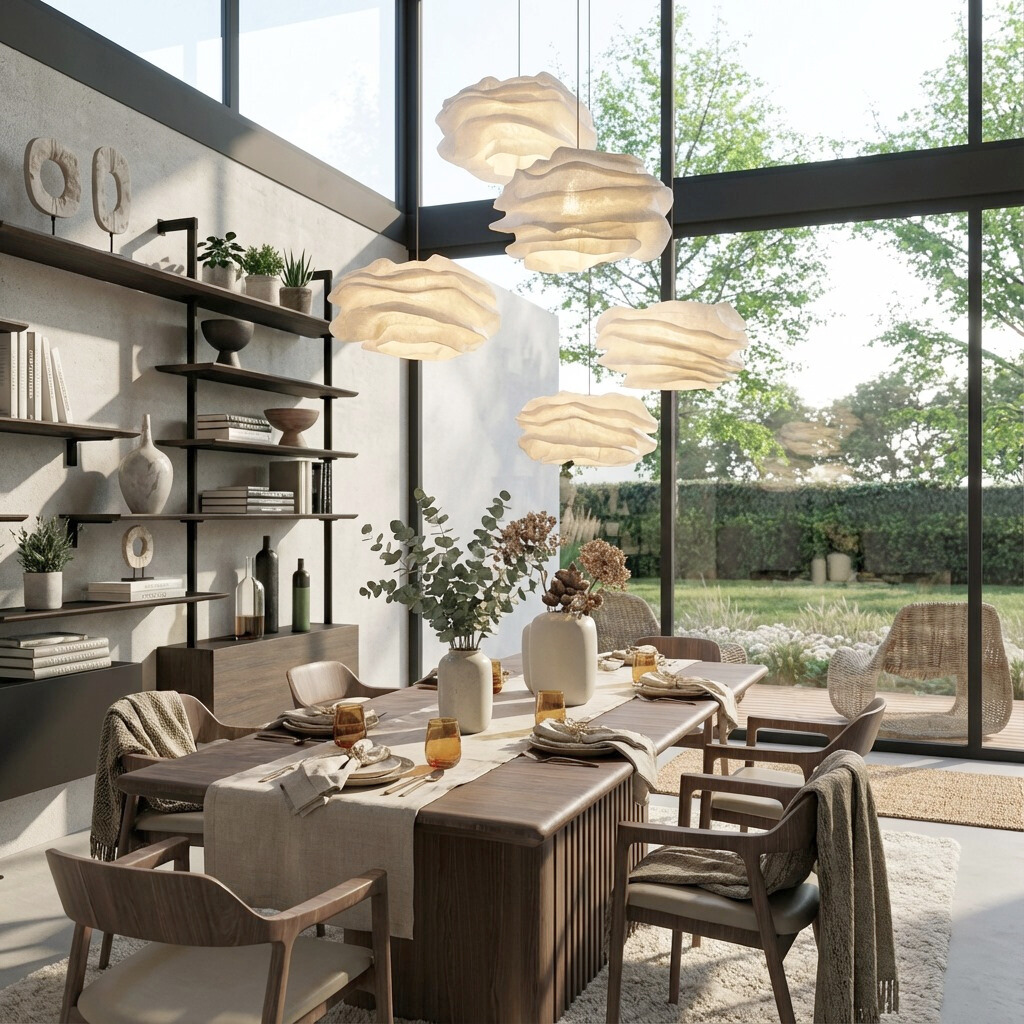 Wnętrze zaprojektowano w stylistyce nowoczesnej, ciepłej elegancji, która łączy minimalistyczne formy z naturalnymi materiałami i stonowaną paletą barw. Otwarta, wysoka przestrzeń salonu z dużymi przeszkleniami zapewnia doskonałe doświetlenie i płynne połączenie z otaczającą naturą.